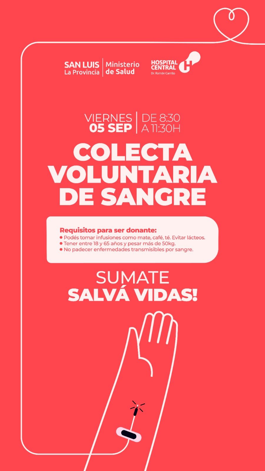 El Hospital ‘Dr. Ramón Carrillo’ invita nuevamente a la comunidad a participar en una jornada solidaria de donación de sangre que se realizará este viernes de 8:30 a 11:30 en el hall principal del establecimiento.
