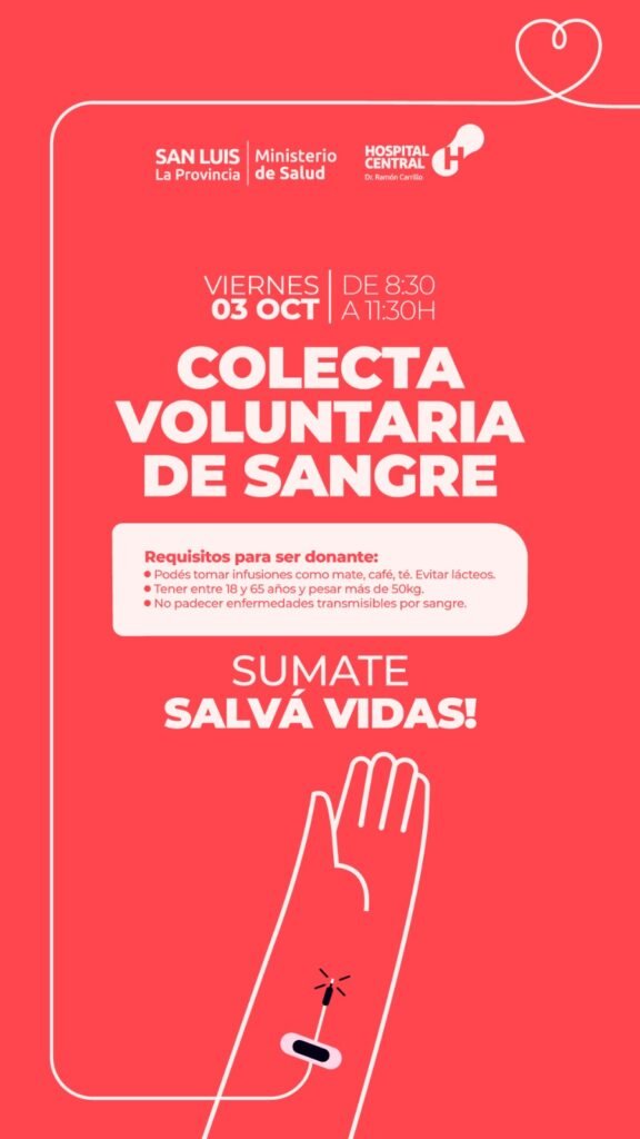 El Hospital Central invita a la comunidad a participar en una nueva campaña de donación voluntaria de sangre, que se llevará a cabo este viernes de 8:30 a 11:30, en el hall principal. Esta iniciativa tiene como objetivo garantizar reservas suficientes para atender emergencias médicas y cirugías programadas, asegurando así la salud y bienestar de los pacientes del sistema de salud local.