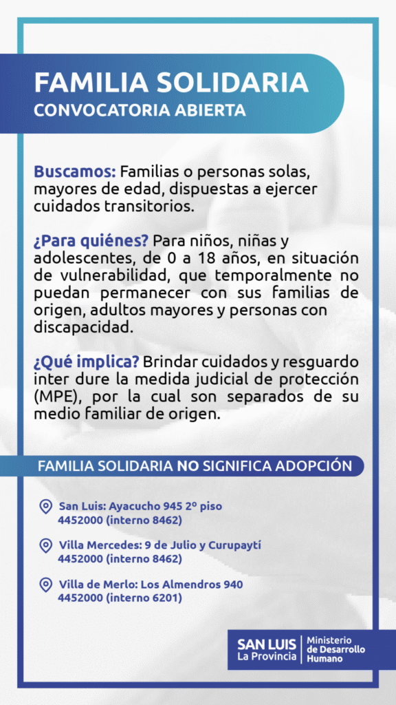 El Gobierno, a través del ministerio de Desarrollo Humano, mantiene abierta la convocatoria para sumarse al programa Familias Solidarias. El mismo, es un dispositivo de protección y contención transitoria destinado a niños, niñas, adolescentes, personas mayores y personas con discapacidad cuyos derechos se encuentran vulnerados.