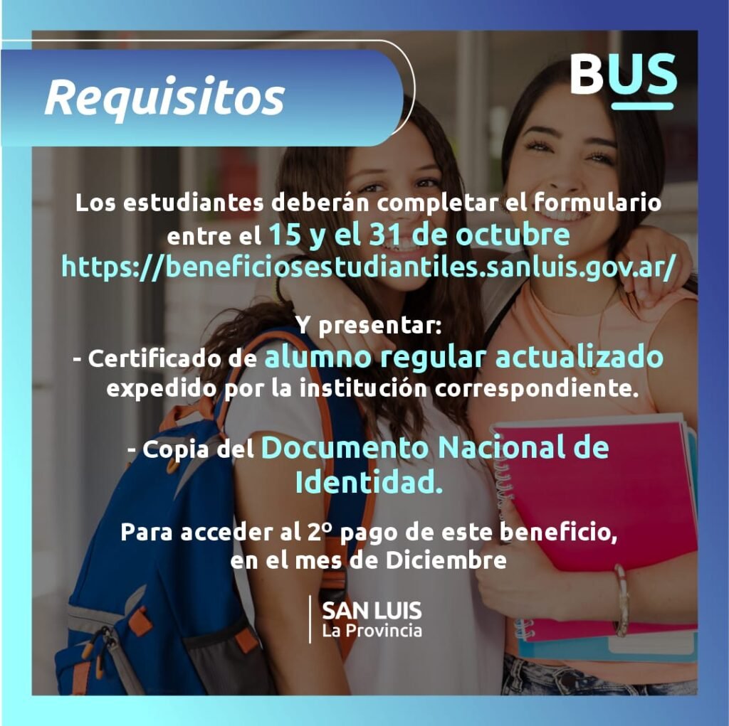 Para acceder al segundo pago, los jóvenes deberán completar el formulario que se encuentra dentro de la página web de la dirección de Beneficios Estudiantiles. El mismo estará habilitado a partir del 15 hasta el 31 de octubre en el sitio web. Allí deberán adjuntar la constancia de alumno regular emitida por la institución de educación Superior (con fecha actual), y también foto del DNI, frente y dorso.