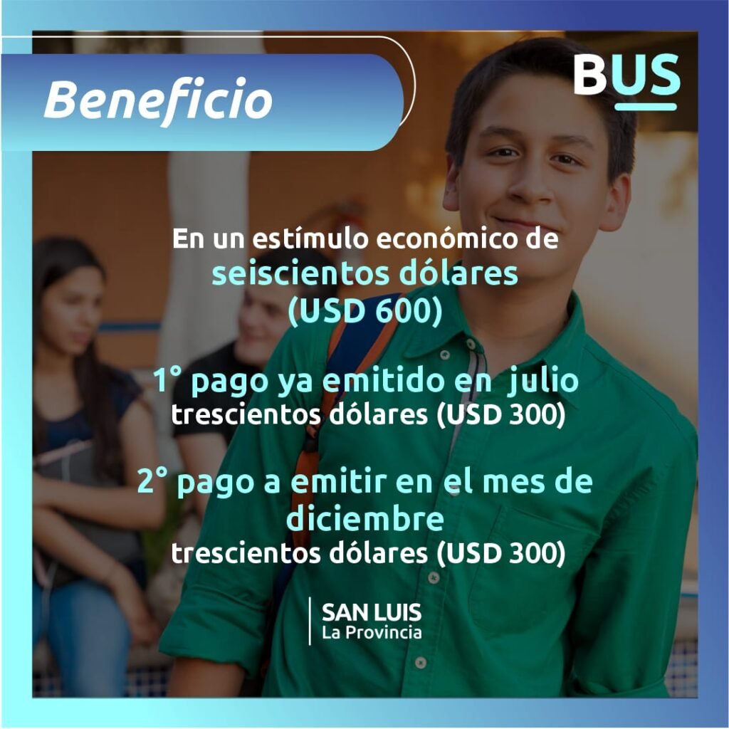 La Beca Universal Superior (BUS) fue creada con el objetivo de fomentar la continuidad educativa, acompañando a quienes finalizan el nivel Secundario y comienzan estudios superiores. Está destinada exclusivamente al primer año de cursada y brinda un apoyo económico total de 600 dólares, distribuido en dos pagos de 300 dólares cada uno: el primero se otorgó en el mes de julio y el segundo, será en diciembre. Esta ayuda busca contribuir con los gastos propios de esta nueva etapa académica.