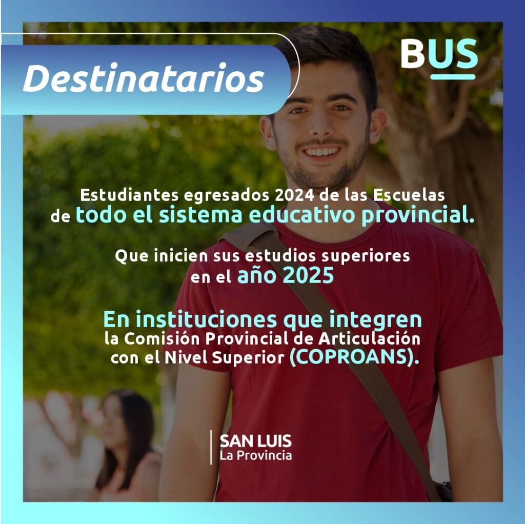 El beneficio está destinado a estudiantes que finalizaron sus estudios secundarios en San Luis durante el año 2024 y que, en 2025, comenzaron carreras de nivel Superior en instituciones que integran la Comisión Provincial de Articulación con el Nivel Superior (CoProANS).