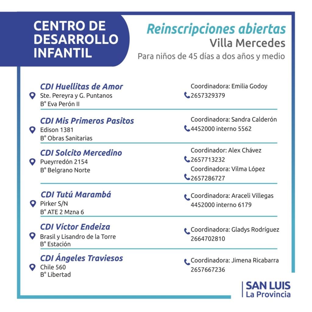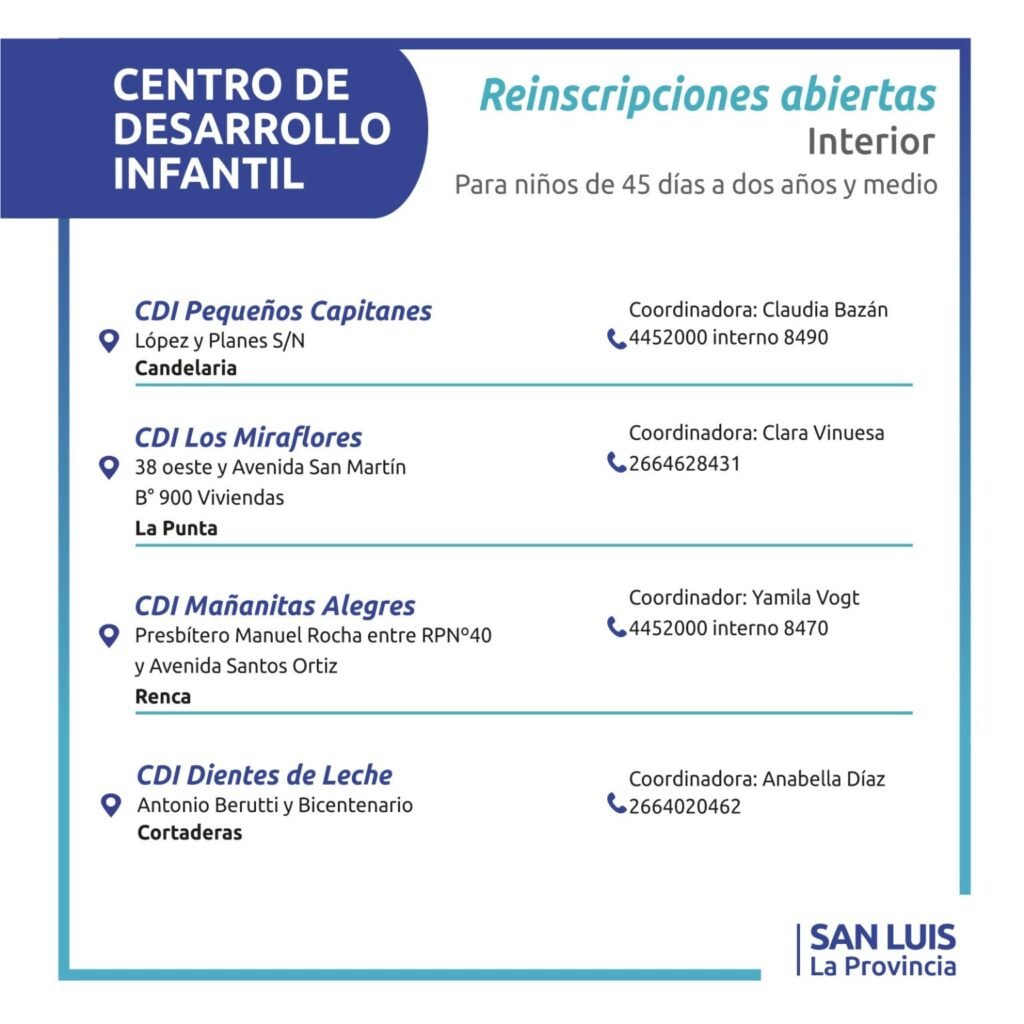 Son establecimientos de contención donde se recibe y atiende a niños y niñas desde los 45 días de vida a los 2 años y medio. Brindan un ambiente propicio de cuidado, confianza y seguridad, promoviendo el desarrollo integral adecuado y sano del niño en su primera infancia. Están destinados a familias vulnerables y con recursos económicos mínimos. Existen actualmente 22 CDI distribuidos en la ciudad de San Luis, Villa Mercedes, La Punta, Cortaderas, Renca y Candelaria