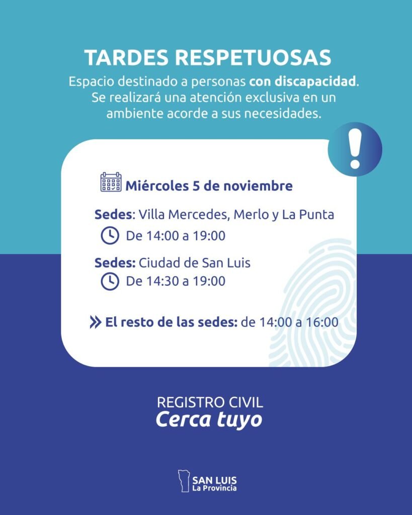 Este miércoles 5 de noviembre, la dirección del Registro Civil y Capacidad de las Personas de San Luis llevará a cabo una nueva jornada de ‘Tardes Respetuosas’, un espacio destinado exclusivamente a la atención de personas con discapacidad en un ambiente adaptado a sus necesidades.