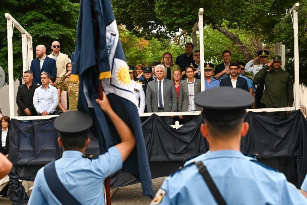 Tras tocar una Diana de Gloria, el inspector Pereyra le comunicó al Primer Mandatario la finalización de la ceremonia, que contó con la participación de la Banda del Ejército Argentino; el jefe de la Policía de San Luis, comisario general Pablo Vieytes; la ministro de Seguridad, Sosa; la directora del Servicio Penitenciario, Karina Mantelli; representantes de la delegación local de Gendarmería Nacional; veteranos de Malvinas y abanderados del Instituto ‘San Ignacio’, la Escuela ‘Paula Domínguez de Bazán’ y las banderas de ceremonia de la PFA, el Ejército y la Policía provincial.