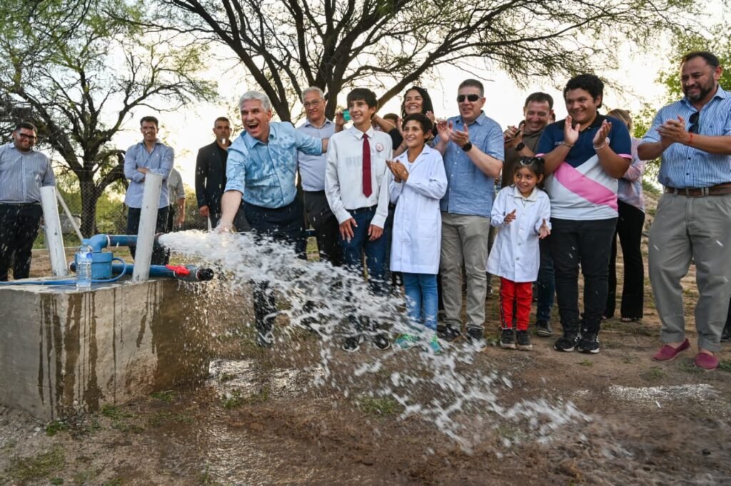 Rodeado de vecinos, el gobernador Claudio Poggi también realizó la apertura simbólica del grifo del pozo público de agua, que marca un antes y un después en la calidad de vida y producción para los residentes de la zona.