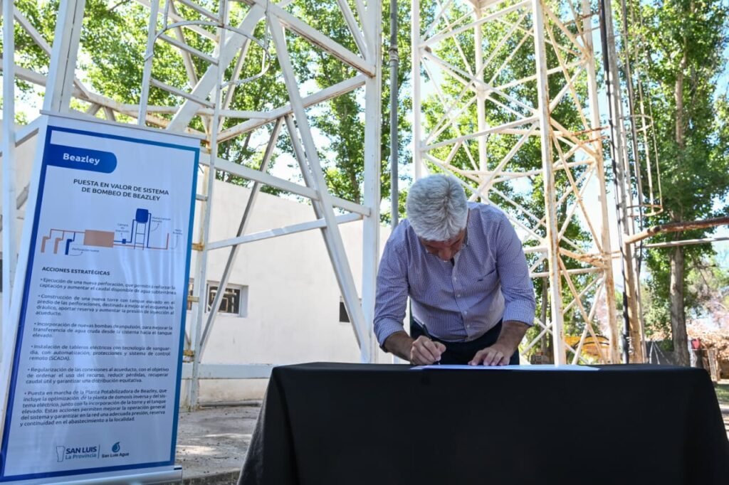 En la planta potabilizadora de la localidad firmó, junto con el Intendente y el gerente operativo de San Luis Agua, Juan Francisco López, el acta compromiso para garantizar el abastecimiento de agua cruda desde el paraje Los Coros hacia Beazley y normalizar la distribución del servicio. Además, rubricó el decreto que habilita la ejecución de una nueva perforación, una obra que reforzará la captación y ampliará el caudal disponible.