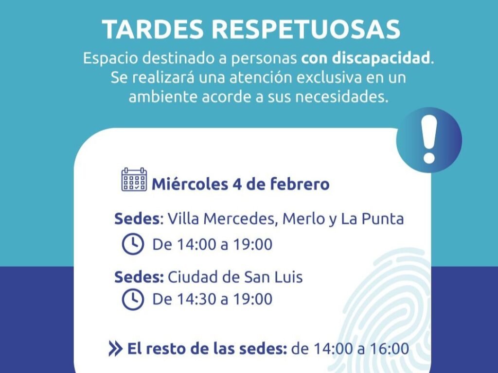 Este miércoles 4 de febrero, las sedes de Villa Mercedes, Merlo y La Punta atenderán en horario extendido de 14:00 a 19:00. Por su parte, la sede de la ciudad de San Luis funcionará de 14:30 a 19:00. El resto de las sedes provinciales habilitarán su atención especial en el horario de 14:00 a 16:00.